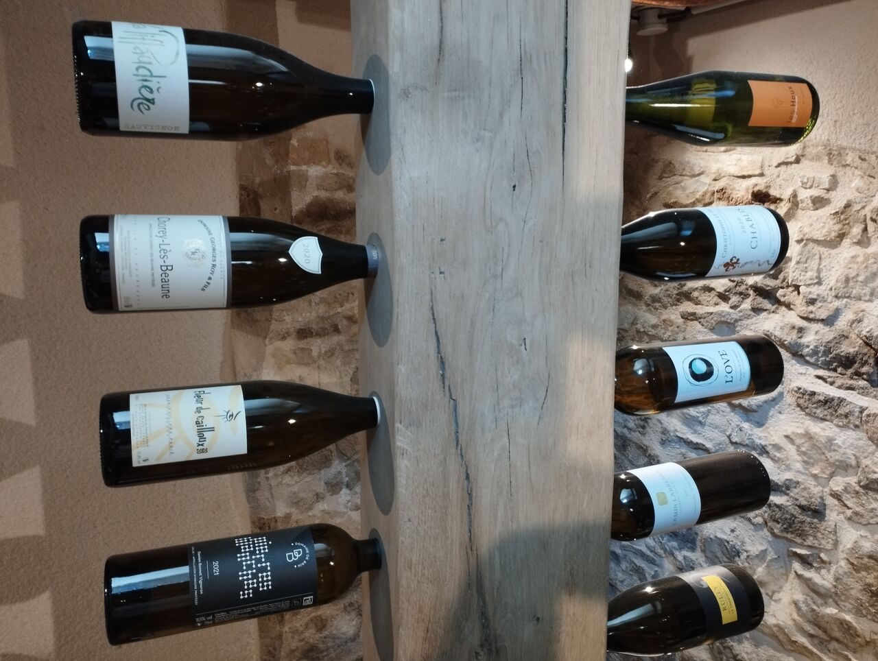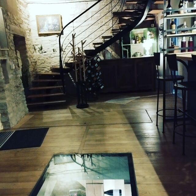 Cave à vin en sous-sol, vitrée. Large sélection de vins (France et même Hors Hexagone).