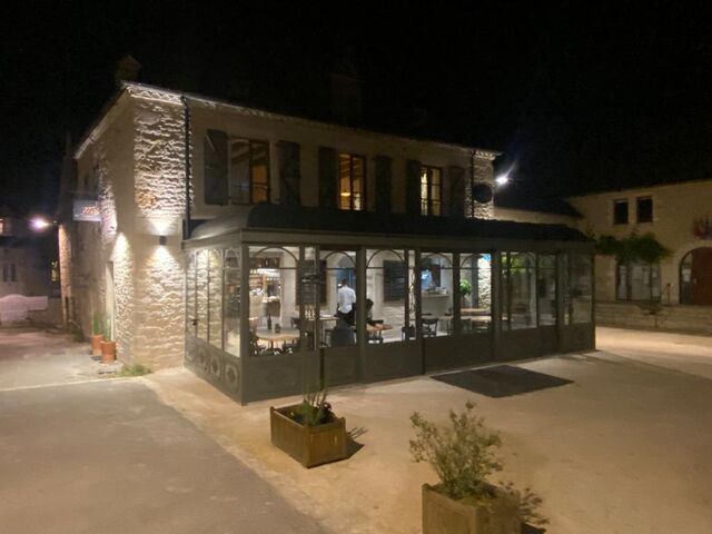 Bistrot de village moderne avec une verrière type Belle Epoque donnant sur la place principale du village.