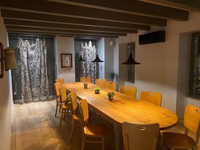 A l'étage une table géante privatisable pouvant accueillir de 12 à 14 couverts, déjeuner ou dîner, privés ou d'affaire.